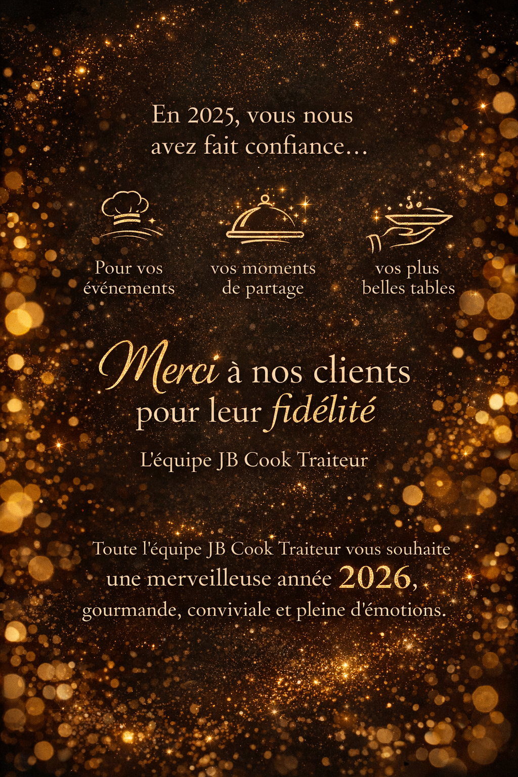 Bienvenue chez JB COOK TRAITEUR, votre partenaire culinaire pour des événements inoubliables. Nous mettons notre expertise en cuisine et notre passion pour les saveurs au service de nos clients professionnels et particuliers. Faites confiance à notre savoir-faire pour ravir vos papilles et celles de vos invités !