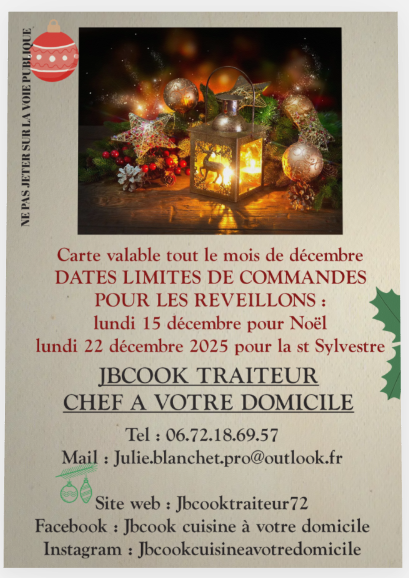 Tout le mois de décembre, JB COOK TRAITEUR vous propose des festivités d'exceptions ... N'hésitez pas à nous contacter pour plus de renseignements ;